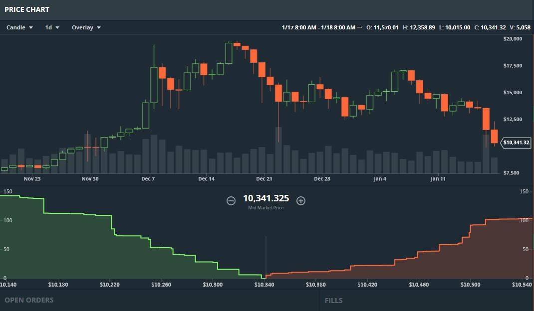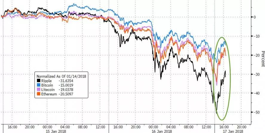 截至1月17日20:10分,美国主流比特币交易平台GDAX最新报价为10341美元附近,而之前最低的时候,该报价甚至有跌破10000美元以下,这相比十二月中旬的19912美元,已经缩水一半。