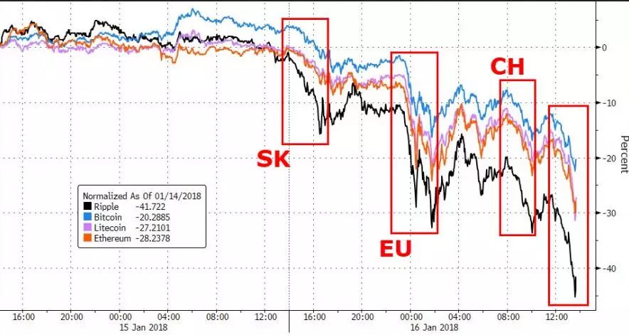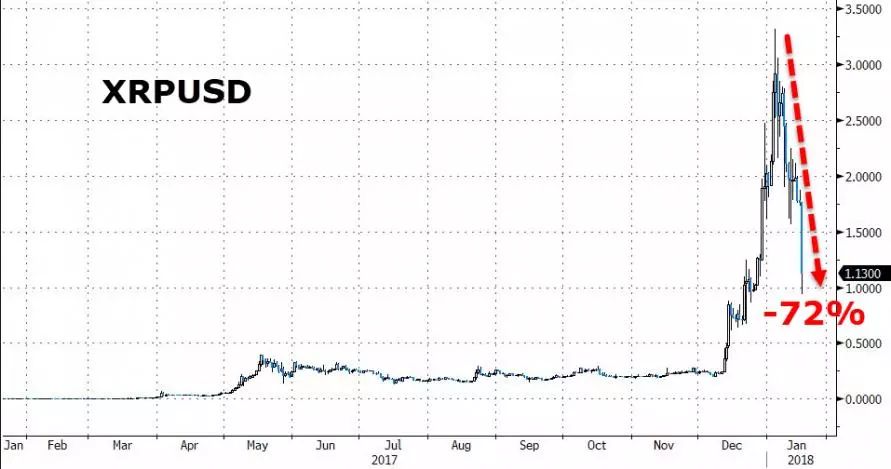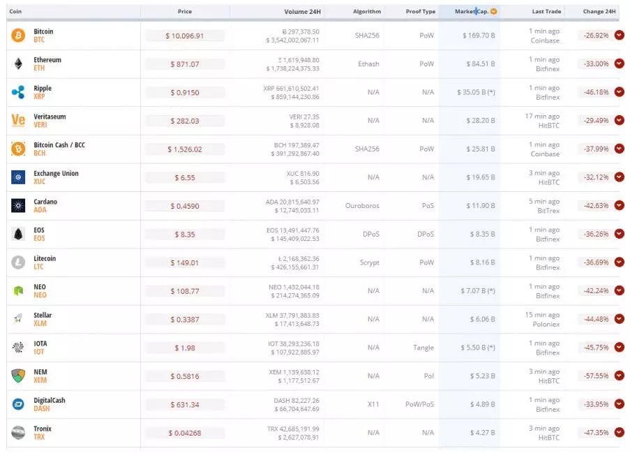 隔夜比特币一度跌破10000美元,瑞波币跌超38%至1美元以下,以太币跌破1000美元关口……