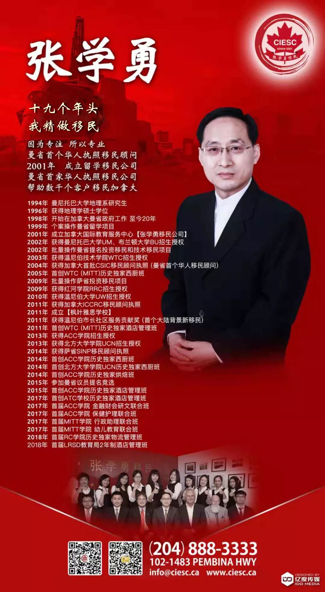 【张学勇移民公司】是曼省政府移民局第一大递案移民中介,每年数百个案例, 是曼省最大的留学移民公司。